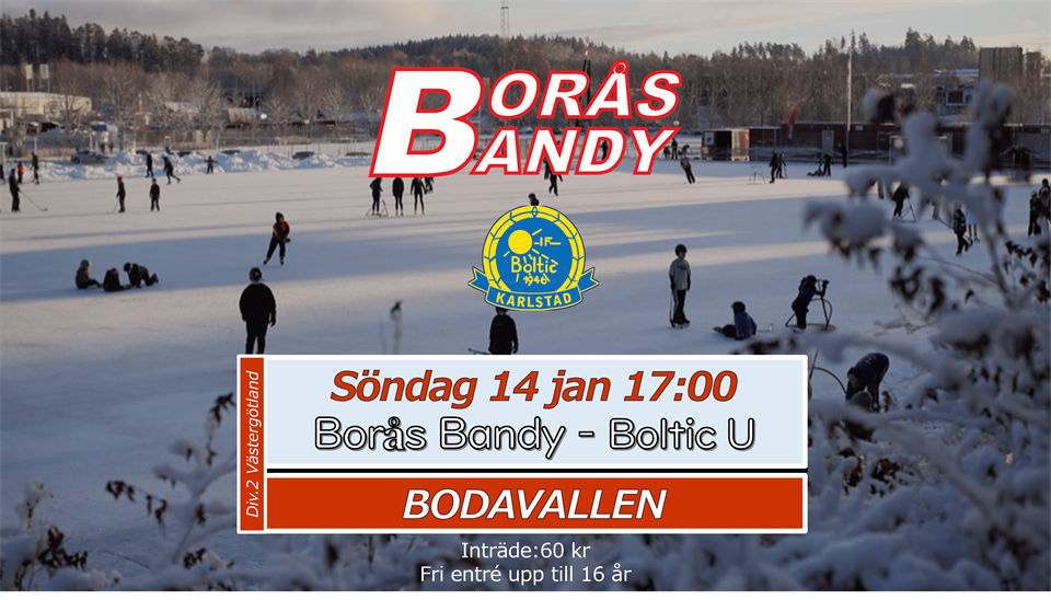 Ännu en vecka har passerat, det är helg och på söndag är ni välkomna till Bodavallen för hemmamatch i Divsion 2 Västergötland! Nu är vi mitt i bandysäsongen, Bodavallen i vackraste vinterskrud och tätt mellan matcherna! Förra helgens match mot BK Wiking gav mersmak med positiva tendser i spelet trots förlust. Det borgar för en bra hemmamatch nu på söndag när Borås Bandy tar emot den nostalgiska Värmlandsklubben IF Boltic (U). Väderprognosen ger solchanser och någon minusgrad! Fyll termosen, plocka fram portföljen och kom med familj,släkt och vänner för en trevlig stund på Bodavallen, så bjuder vi på en underhållande och bra match! Varmt välkommen! Matchtid: Söndag 14 januari - 17:00 Plats: Bodavallen, Sjumilagatan 6 Borås Entré: 60 kr Fri entré upp till 16 år Fiket öppet- bra musik och kul bandy. Välkomna! Vill du stödja Borås Bandy lite extra? Klicka här för att bli stödmedlem Tack till alla samarbetspartners, ideella krafter & Borås Stad - Ert engagemang möjliggör och utvecklar bandysporten i Borås!