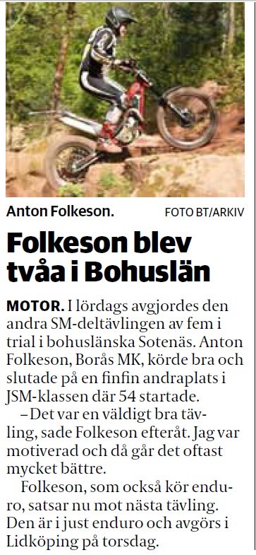I lördags avgjordes den andra SM-deltävlingen av fem i trial i bohusländska Sotenäs. Anton Folkeson från Borås MK körde såpass bra att han slutade på en fin andraplats i JuniorSM-klassen där det var 54 startande. "-Det var en väldigt bra tävling", sade Folkeson efteråt. "-Jag var motiverad och då går det oftast mycket bättre." Folkeson som också kör enduro satsar nu mot nästa tävling som är just i enduro och körs i Lidköping på torsdag. Borås Motorklubb 6 maj 2013 0kommentarer