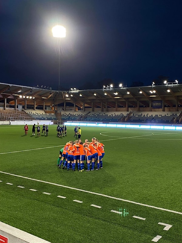Vi samlades 17:00 i omklädningsrummet där pastasallad var framdukat. Ida, en av våra lagledare hade stått och hackat i timmar för att mätta truppen. Nervösa, pirriga, peppade tjejer började strömma in och vi alla kände förväntan i luften. Musik, massage, mat och nervösa skratt fyllde omklädningsrummet. Vi var taggade! Vi gick ut och värmde upp- STOR plan möttes vi av, vilket vi var förberedda på. Musik i högtalarna och publiken började strömma in. Laget kändes väldigt samlat, fokuserat och redo för uppgiften. Som alltid inför match går vi in med inställningen att vi ska njuta, ha kul och göra vårt bästa. Men det gällde lite extra idag- njuta- av publiken, motståndet, arenan och varandra!