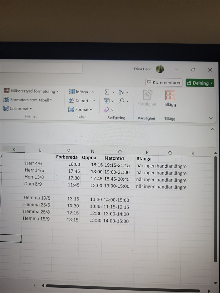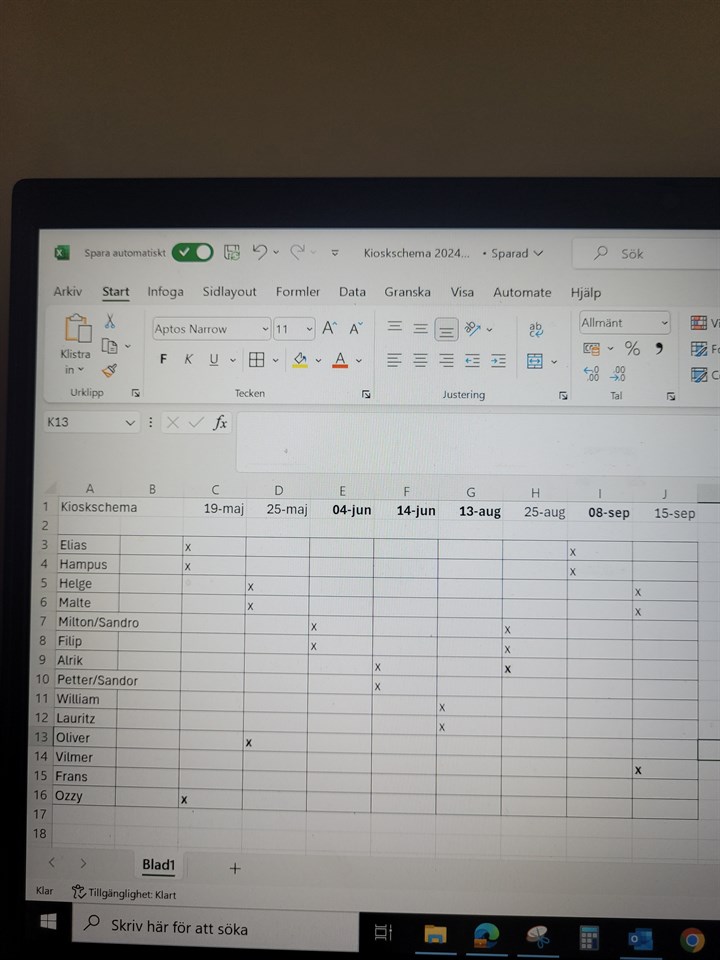 Här kommer schema för när ni föräldrar ansvarar för kiosken samt för att vara matchvärd på våra hemmamatcher. Det är tre ansvariga familjer varje hemmamatch. Två för kiosken och en för matchvärd. Ni gör själva upp vem som ansvarar för vilken uppgift. Det går såklart också bra att bytas om under matchen. Kiosken ska öppna 30 min innan matchstart. Tiderna som står angivna i schemat är tid för matchstart. Nycklar och kassa hämtas hos Carin i Ströbylund. Stäm av med henne hur ni överlämnar kassa och nycklar några dagar innan ert pass! Vårt lag ansvarar också för kiosken på några av Herr/Dam- matcherna. Vi har då ingen uppgift att vara matchvärd, därför är det endast två familjer som står uppskrivna dessa tider. Vid herr/dammatcher ska kiosken öppna en timme före matchstart. Om man inte kan den tilldelade tiden så ansvarar man själv för att byta med någon annan familj. Meddela mig om eventuella byten så att jag kan uppdatera schemat. De familjer som har andra uppdrag i föreningen eller i laget har bara tilldelats ett pass var (i de flesta fall tänkt som matchvärdar). Övriga familjer har två pass var. Hör av er för frågor och funderingar och kolla kalendern redan nu och skriv ner era dagar och tider. P-13 21 maj 2024 5kommentarer