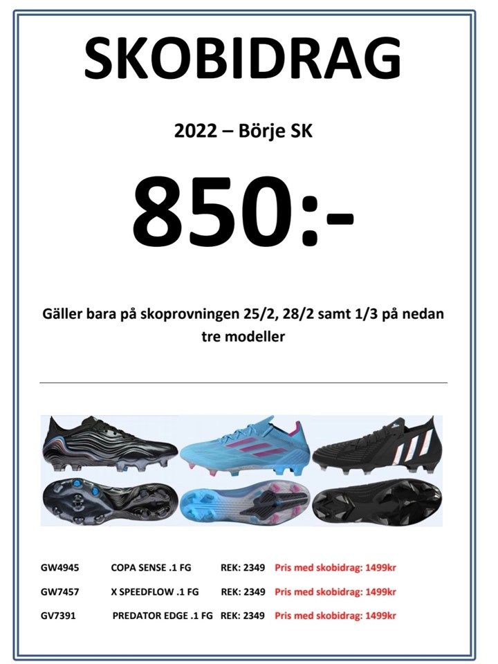 Tillsammans med Intersport och Adidas erbjuder vi ett skobidrag på 850kr. För att köpa skor åker ni till Intersport Boländerna för att prova ut skor mellan 12:00-18:00 25/2, 28/2 eller 1/3. Väljer ni att köpa ett par skor så bokar ni dom i butiken, meddelar undertecknad och swishar 1499kr till BSK swishnr. Vi hämtar ut dina skor när dom kommit och tar med dom till träningen. Skobidraget gäller bara på tre modeller från Adidas GW4945 COPA SENSE .1 FG REK: 2349 Pris med skobidrag: 1499kr GW7457 X SPEEDFLOW .1 FG REK: 2349 Pris med skobidrag: 1499kr GV7391 PREDATOR EDGE .1 FG REK: 2349 Pris med skobidrag: 1499kr Herr 16 feb 2022 0kommentarer