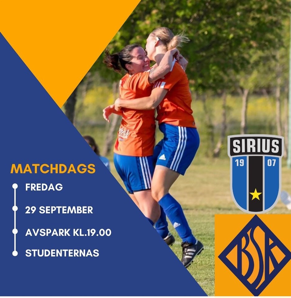 MEDDELANDE FRÅN DAMLAGET! Redan nu går vi ut med info så ni hinner fixa biljetter, tvätta era orangea tröjor och träna på flaggviftande och sjunga ramsor! Det är fritt inträde men man måste boka fribiljetter via deras hemsida. siriusfotboll.ebiljett.nu Läs mer på deras hemsida och så ses vi där och gör Studan blå/orange för en kväll!