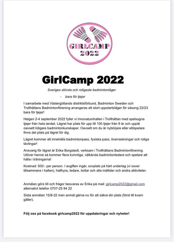 Hej! Här nedan bifogar jag information angående ett träningsläger för tjejer. All information ser ni på bilden! Nybörjargrupp 1 10 apr 2022 0kommentarer