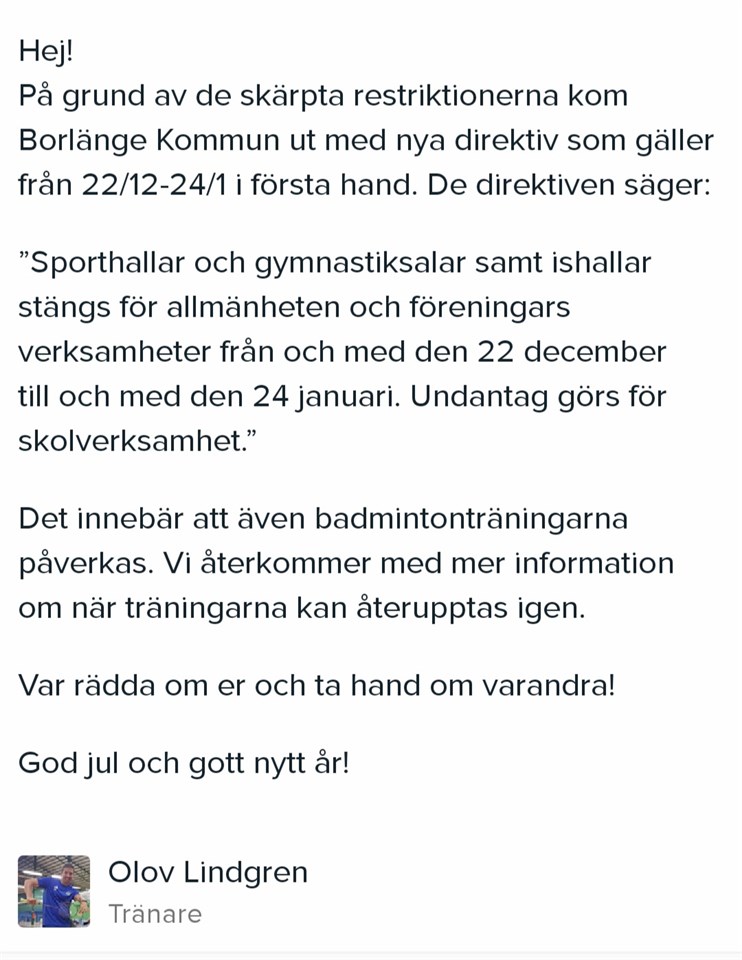 Hej! Då utvecklingen i samhället tyvärr inte går åt rätt håll när det gällt Covid-19 så har vi tränare beslutat oss för att det inte blir några fler badmintonträningar nu under våren. Väldigt tråkigt då vi in i det sista hoppades på att vi skulle få avsluta säsongen med några träningar. Men nu är det som det är och vi vill rikta ett stort tack till alla fantastiska barn som deltagit i träningarna under den här säsongen. Det har varit så roligt att följa deras utveckling och att få spela badminton med dem. Vi satsar på att dra igång höstterminens träningar ungefär samtidigt som skolorna börjar men vi återkommer närmare med vilket datum som gäller. Ha nu en härlig sommar och var rädda om er så hoppas vi att tiderna snart kan återgå till mer normala. Många varma hälsningar från tränarna Nybörjargrupp 1 11 apr 2021 1kommentar