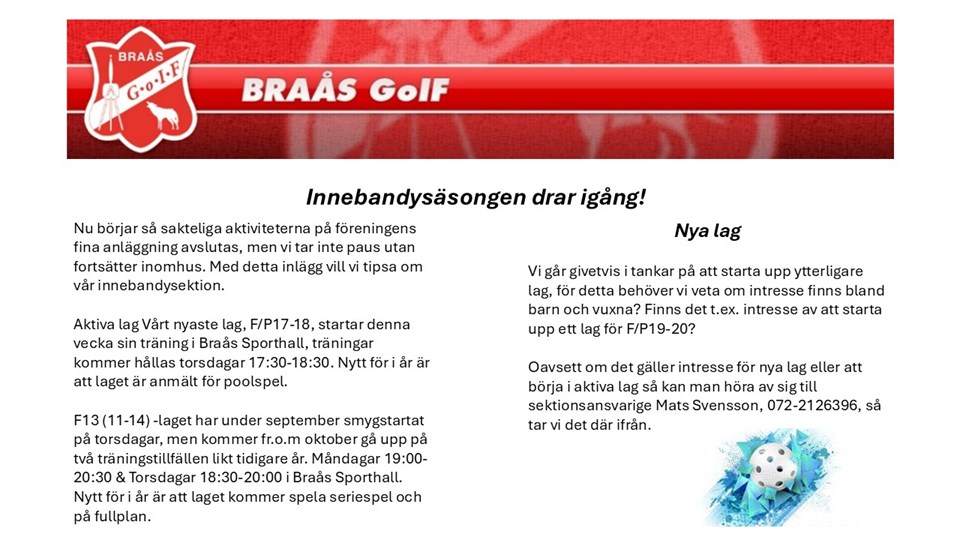 Nu börjar så sakteliga aktiviteterna på föreningens fina anläggning avslutas, men vi tar inte paus utan fortsätter inomhus. Med detta inlägg vill vi tipsa om vår innebandysektion.