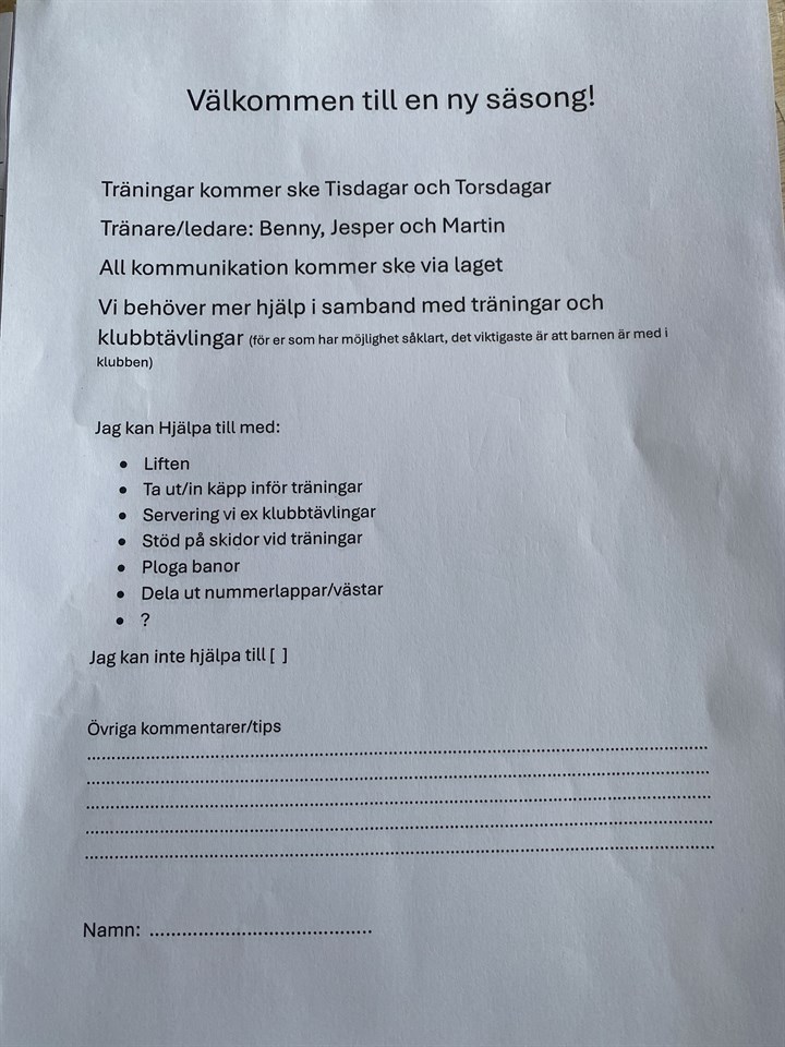 Tisdag Helen Henriksson tar emot barnen och har nödvändig information. Mattias Arnesson plogare Daniel Carlsson lift Torsdag Klubbtävling Servering/nummerlappar Anna Linder och Jennie Eriksson Alla som kan tar skidor och hjälper till att ploga och bära käpp, kom gärna till 17:30 Alla som befinner sig i backen skall bära väst. Sen får ni gärna hjälpa till på skidor på träningarna även om ni inte är uppskrivna, ju fler vi blir desto bättre flyt får vi på träningarna. Längre planering kommer när jag fått in svar från alla. Ses till veckan //Martin träningarna. Träningsgrupp 12 jan 1kommentar