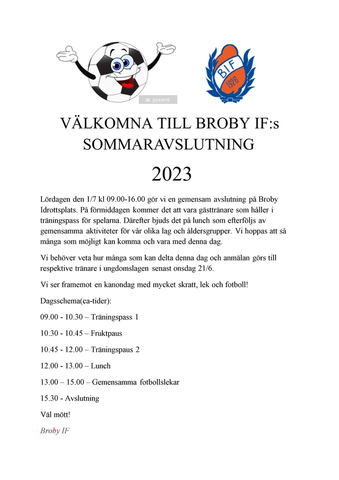 VÄLKOMNA TILL BROBY IF:s SOMMARAVSLUTNING 2023 Lördagen den 1/7 kl 09.00-16.00 gör vi en gemensam avslutning på Broby Idrottsplats. På förmiddagen kommer det att vara gästtränare som håller i träningspass för spelarna. Därefter bjuds det på lunch som efterföljs av gemensamma aktiviteter för vår olika lag och åldersgrupper. Vi hoppas att så många som möjligt kan komma och vara med denna dag. Vi behöver veta hur många som kan delta denna dag och anmälan görs till respektive tränare i ungdomslagen senast onsdag 21/6. Vi ser framemot en kanondag med mycket skratt, lek och fotboll! Dagsschema(ca-tider): 09.00 - 10.30 – Träningspass 1 10.30 - 10.45 – Fruktpaus 10.45 - 12.00 – Träningspaus 2 12.00 - 13.00 – Lunch 13.00 – 15.00 – Gemensamma fotbollslekar 15.30 - Avslutning Väl mött! Broby IF P2014 15 jun 2023 1kommentar