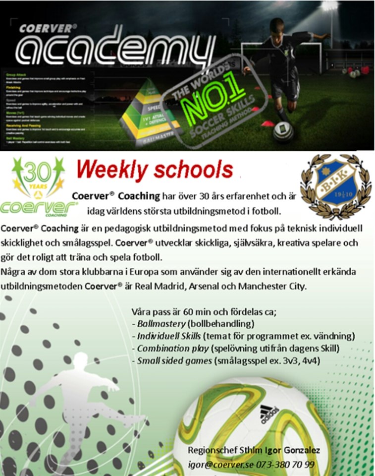 Även i år kommer vi kunna erbjuda alla spelare i Bromstens IK födda mellan 04 – 08 en möjlighet att bättra på sin teknink och bollbehandling m.m genom att under 10 st träningspass (5 på våren & 5 på hösten – 1 timme/gång) tränas av professionella akademi tränare. Vi har valt att använda oss av Coerver Coaching i år igen. I år har vi årskullar som är ganska stora och vi kommer endast kunna erbjuda ett begränsat antal platser, så principen ’först till kvarn’ kommer att gälla. Som vanligt är klubbens rekommendation att detta är att anses som en extra träning och ska inte ersätta den ordinarie träningen med laget. Använd länken nedan för att anmäla dig. Ordinarie kostnad för 10 gånger är 895:-/gång. Men klubben går in och subvisionerar med endel. Så varje spelare betalar endast 595:- för 10 gånger. Kostnaden faktureras i efterskott.  Bromstens IP (Naturgräset) Torsdagar v18-22 och v34-38 (start 4 maj om vi fått tillgång till gräset då) Pass 1 kl 17-18 – 2st grupper om ca. 16-18 spelare/grupp Pass 2 kl 18-19 - 2st grupper om ca. 16-18 spelare/grupp Baserat på intresse i varje ålderskull så kan grupperna slås ihop eller göras om något. 595:-/deltagare(faktureras av klubben med betalning i slutet av period 1). - Träningar en timme i veckan (torsdagar) med professionella Coerver instruktörer - Anpassad träningsplanering utifrån ålder och kunskap - Anmälan görs till er lagledare för respektive lag och nedan ANMÄL ER HÄR: https://docs.google.com/forms/d/e/1FAIpQLSem7WJUhH30GqVUvX7qTje2IMudx5cwUs7dq6w6lmBq_w9R8A/viewform?c=0&w=1 F06 20 apr 2017 0kommentarer
