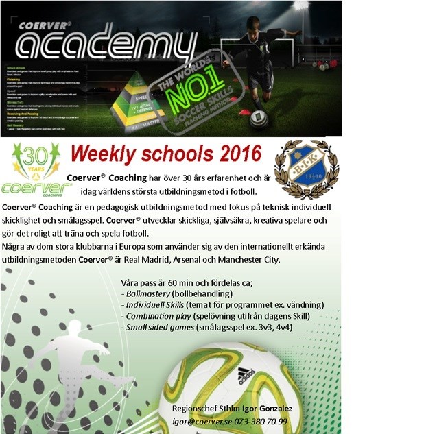 Hej alla Spelare I Bromstens IK födda 2003 - 2007 Samma som förra året vill vi även i år kunna erbjuda alla spelare i Bromstens IK födda mellan 03 – 07 en möjlighet att bättra på sin teknik och bollbehandling m.m genom att under 10 st träningspass (5 på våren & 5 på hösten – 1 timme/gång) tränas av professionella akademi tränare. I år avänder vi oss av Coerver Coaching: Bromsten Coerver academy 2016 Individuell teknikträning för spelare födda 2003-2007 Plats: Bromstens IP Tid: Onsdagar v19-23 och v34-38 (start 4 maj om vi fått tillgång till gräset då) 17:00 P05, F02 18:00 P07, P06, F06 19:00 P03, P04 Obs. Startdatum Onsdag 11 Maj Baserat på intresse i varje ålderskull så kan grupperna slås ihop eller göras om något Pris: 495:-/deltagare (faktureras av klubben med betalning i slutet av Maj). Ordinarie pris 895:-. Klubben går in och subvisionerar med hälften. - Träningar en timme i veckan (10 st Onsdagar) med professionella Coerverinstruktörer - Anpassad träningsplanering utifrån ålder och kunskap Anmälan görs via bifogat formulär och till er lagledare/tränare för respektive lag. I samråd med er tränare får ni sen avgöra om ni vill köra detta som ett extra träningspass eller byta ut någon av er ordinarie träningstid/dag. Anmälan F06 2 maj 2016 0kommentarer