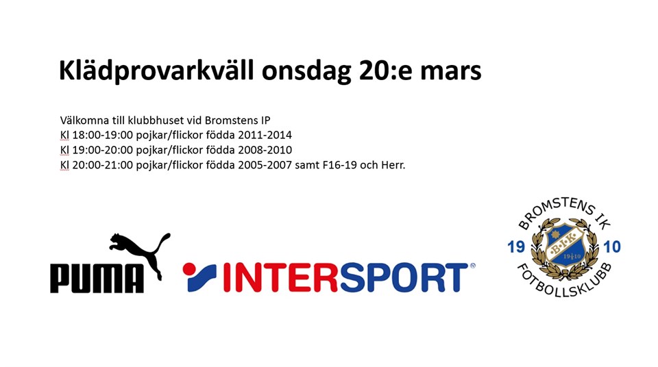 Klädprovarkväll onsdag 20/3 Onsdag 20:e mars kommer Puma och Intersport till klubbhuset vid Bromstens IP och visar upp årets klädkollektion. Då finns det möjlighet att på plats prova och beställa Bromstenskläder. Strumpor, shorts och neckwarmers kommer kunna köpas direkt på plats, övriga kläder i kollektionen beställs för senare leverans. I vår webshop hittar ni priser och produkter. https://team.intersport.se/team/bromstens-ik/ För att inte alla ska komma samtidigt har vi delat upp kvällen med början med de yngsta lagen kl 18:00, om tiden inte passar går det bra att komma på någon av de övriga tiderna. Kl 18-19, Pojkar/flickor födda 2011-2014 Kl 19-20 Pojkar/flickor födda 2008-2010 Kl 20-21 Pojkar/flickor födda 2005-2007 samt F16-19 och Herrlag Plats: klubbhuset vid Bromstens IP, Duvbovägen 101. Betalning sker via kort eller faktura, vi hanterar inte kontanter. Välkomna Styrelsen Bromstens IK F 10/11 12 mar 2019 0kommentarer