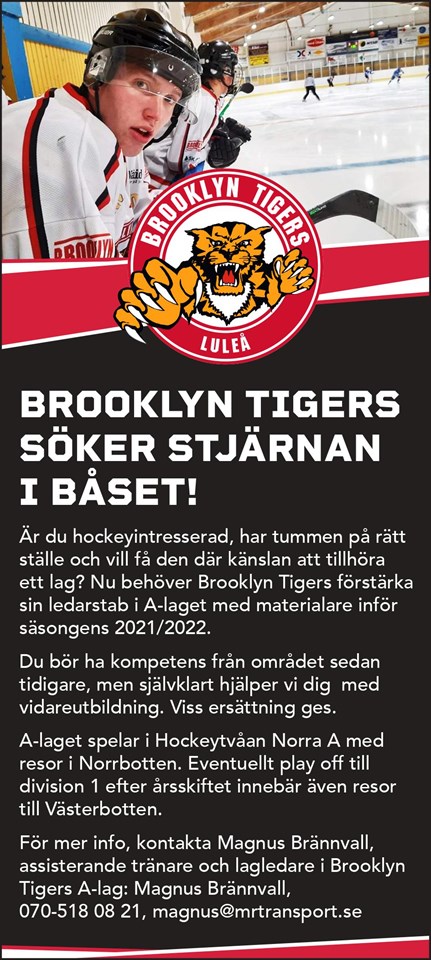 Brooklyn Tigers behöver förstärka sin ledarstab med materialare inför säsongen 2021/2022. Vet du någon person i din närhet som är intresserad av att komma in i ett lag, känna pulsen under matcherna och vara delaktig i prestationen. Materialaren är väldigt viktig i lagbygget och en del av ledarstaben. Kontakta Magnus Brännvall, assisterande tränare och lagledare i A-laget: 070 518 08 21, magnus@mrtransport.se
