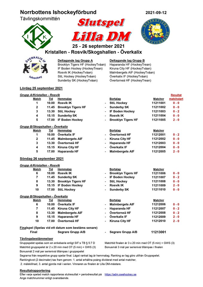 Brooklyn Tigers inledde Lilla DM med en derbyseger mot Sunderbyn (3-2 e sudden), men första dagen i Rosvik fick en bitter eftersmak sedan Boden vunnit med 8-2. ”Vi ville inte göra smutsjobbet”, säger BT:s lagkapten Kevin Lillström Stenroos. Brooklyn Tigers inledde DM i Rosvik med en skön derbyseger mot Sunderbyn. Efter en jämn förstaperiod tog BT initiativet första halvan av den andra perioden, men i slutskedet kvitterade ”Byn” till 2-2 i spel 5 mot 3. BT fick ändå sista ordet när lagets assisterande kapten Rickard Jakobsson-Ström tryckte in segerpucken till 3-2 i förlängningen. - Skönt att starta med en vinst, säger forwarden och lagkaptenen Kevin Lillström Stenroos. I BT-målet imponerade Elias Liljebäck. I den andra matchen ställdes BT mot nybildade division 3-laget Bodens HF med Petter och Jesper Nilsson i båset. Boden fick starta matchen med en 2-0-ledning som division 3-lag, men halvvägs in i den första perioden var BT ikapp till 2-2 efter mål av Jakob Müller och Simon Körberg. Men sen var det roliga slut. Boden vände och vann med hela 8-2 och det var ett besviket Brooklyn-läger efteråt. - Det var våra första matcher på nästan ett år. Under hela dagen har vi kämpat med positionerna och alla måste bidra med en positiv energi. Vi ville inte göra smutsjobbet mot Boden, säger Lillström. - Jag är jättebesviken. Vi lägger ner en enorm energi på det här, men vi var inte bra mot Boden. Jag ska inte skylla på omständigheter, men vi är ett spelande lag och det fungerade inte när vi spelade sent mot Boden på den här isen, säger BT-tränaren Magnus Brännvall. Målen, BT mot Sunderbyn: Robin Berggren, William Sandsten, Rickard Jakobsson-Ström. Målen, BT mot Boden: Jakob Müller, Simon Körberg. Under söndagen väntar Rosvik kl 10 och STIL Hockey kl 13.30 i Kristallen i Rosvik. Matcherna spelas 2 x 20 minuter.