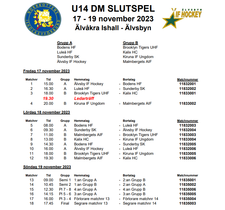 Hej alla tigrar, September är snart avklarad och nu blickar vi framåt mot oktober. DM i Älvsbyn Det närmar sig vårt första distriktsmästerskap som i år spelas i Älvsbyn helgen 17-19 november. Det har till ledarstabens framkommit information att flertalet spelare har bokat NHL hockey i Globen denna helg. Om man inte kan delta i DM-spel, vänligen meddela oss ledare snarast möjligt. Laget kommer inte att övernatta i Älsvsbyn och egen transport gäller. I vanlig ordning kommer laget att styra upp samåkningsmöjligheter. Vi hoppas på bra föräldrastöd i Älvåkra ishall i november. Klimpen Cup - Skellefteå Kommande helg 6-8 oktober är det dags för cup nummer tre för våra tigrar. Spelchema - Första matchen spelar fredag 14.00. - Samling 12.30 i Skellefteå. Viktigt att grabbarna ätit för att kunna spela match. - Måltider som ingår i turneringen: middag fredag och lördag, lunch lördag och söndag, frukost lördag och söndag, kvällsfika fredag och lördag. - Egenavgift: 500 kr. Swishas till lagets swishnummer innan cupstart, 076-1399234 - Utrustning: Hockeyutrustning, uppvärmingskläder, lagkläder mellan matcher, kläder och ombyte för tre dagar, jacka, andra skor än tofflor, fickpengar för eventuellt kvällsfika eller tilltugg. - Boende på Hotell Malmia Egen transport, fördelning bilarna enligt nedan. Bil 1: Elias, Otto Bil 2: Frans, Oliver Bil 3: Theo, Oskar, August Bil 4: Neo Bil 5: Hugo, Axel Bil 6: Liam, Loke Bil 7: Casper, Aron. Bil 8: Edvin, Olle Chauffören i varje bil meddelar avresetid. Seriespel Serien drar igång i oktober och vi kommer att spela i den södra serien. Vi kommer att möta alla lag fyra gånger, totalt 20 matcher. Planen är att vi ska spela samtliga fyra möten mot Kiruna i Luleå. I samband med våra hemmamatcher kommer föräldrarna att hjälpa till främst i sekretariatet. Mer info kommer. Lag i serien: Kiruna Älvsbyn Sunderbyn Piteå Boden Brooklyn Spelschema serien Cuper Laget kommer efter Skellefteå att spela fler cupen under säsongen. Nu när spelschemat för serien är klart kan vi planera passande och utmanande cuper för resterande del av säsongen. Höslovshockey Brooklyn Tigers kommer att anordna en egen sportlovshockey måndag och tisdag vecka 44. Trevlig helg /Ledarna