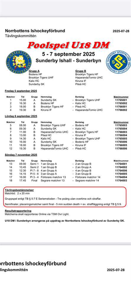 Då börjar det närma sig U18 DM i Sunderby ishall. Jag lägger ett dokument på vår laget.se sida för er att titta på. Spelarna kommer äta lunch och middag där under DM. Mer information och kallelser kommer senare. Kostnad: 600kr/spelare, detta swishar varje spelare senast 5/9 till 123 123 6876 skriver DM och barnets namn. Mvh lagledarna Torbjörn och Magnus U18 HF 22 aug 2025 0kommentarer