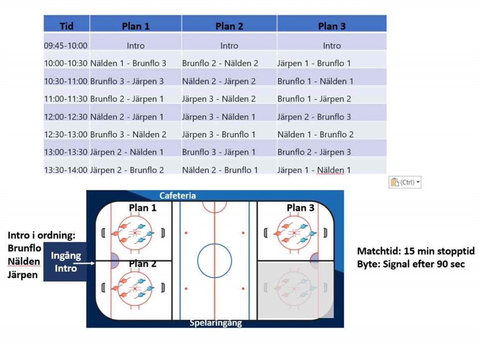 Samling Nässkottshallen, Nälden 09:00 Där vi byter om tillsammans. Här kommer lagindelningen till i morgon. Lag 1 Danne O & Pär Lukas S Loke Olle Jesper Milo Lucas G-S Ture Zeke Hardy Lag 2 Niklas & Fredde Oskar Malte Arvid Milian Otto Elis Kevin Jacob Ebbot Lag 3 Danne V & Hampus Vidar Charlie Wille Alvin Oliver Jonathan Moltaz Tech Elias U10 Lag 16 24 feb 2024 0kommentarer
