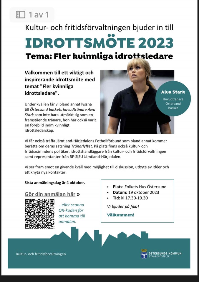 Hej idrottsförening! Nu bjuder Kultur- och fritidsförvaltningen i Östersunds kommun in till det viktiga och inspirerande idrottsmötet, i år med temat "Fler kvinnliga idrottsledare". Under kvällen får vi bland annat lyssna till Östersund baskets huvudtränare Alva Stark som inte bara utmärkt sig som en framstående tränare, hon har också varit en förebild inom kvinnligt idrottsledarskap. Vi får också träffa Jämtland-Härjedalens Fotbollförbund som bland annat kommer berätta om deras satsning Tränarlyftet. På plats finns också kultur- och fritidsnämndens politiker, idrottshandläggare från kultur- och fritidsförvaltningen samt representanter från RF-SISU Jämtland-Härjedalen. Vi ser fram emot en givande kväll med möjlighet till diskussion, utbyte av idéer och att knyta nya kontakter. • Plats: Folkets Hus Östersund • Datum: 19 oktober 2023 • Tid: kl 17.30-19.30 Sista anmälningsdag är 4 oktober. ? Anmäl dig här: https://forms.office.com/e/NUrpT2AM85 Vi bjuder på fika! Välkommen!
