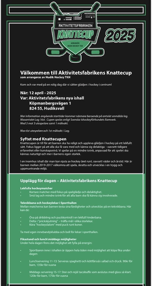 Här finns lite mer info kring knattecupen i Hudiksvall, tider för matcher får vi senare.