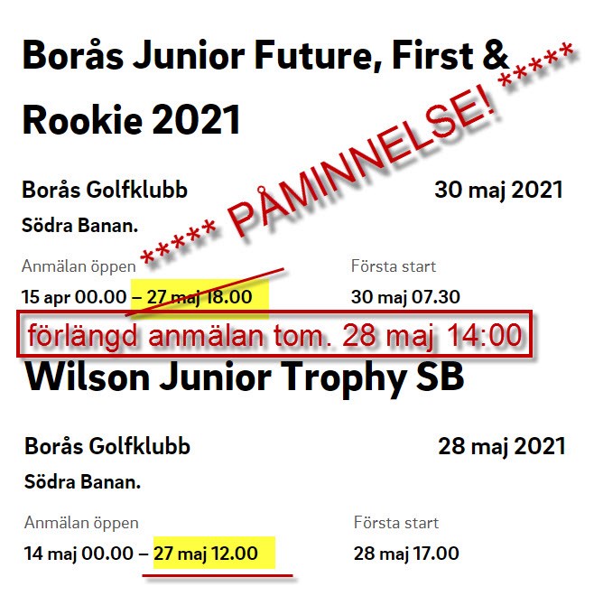 ***Uppdatering: anmälningstid för Borås Junior Future,First & Rookiea är förlängd till 14:00 idag 28/5*** ____________________________________________________ Idag är sista dagen för anmälan till vår uppstarts-tävling inför Touren i år. Det går anmäla sig fram till 18:00 i kvåll. Det blir superfint väder så jag hoppas ni har möjlighet att delta. Anmälan för fredagens Wilson Junior Trophy går ut idag klockan 12:00 Ni anmäler er till alla tävlingar på Golf.se Väl mött! Team Utveckling 27 maj 2021 1kommentar