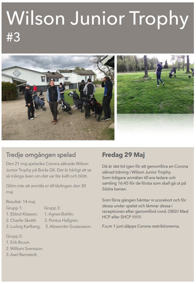 Tredje omgången spelad Den 21 maj spelades Corona säkrade Wilson Junior Trophy på Borås GK. Det är härligt att se så många även om det var lite kallt och blött. !!Glöm inte att anmäla er till tävlingen den 30 maj (Info kommer strax i separat nyhet)!! Fredag 28 Maj *** Med korvgrillning vid samling *** Då är det tid igen för att genomföra en Corona säkrad träning i Wilson Junior Trophy. Som tidigare anmälan till era ledare och samling 16:45 för de första som skall gå ut på Södra banan. Som förra gången hämtar ni scorekort och för dessa under spelet och lämnar dessa i receptionen efter genomförd rond. OBS!! Med HCP eller SHCP !!!!!!! F.o.m 1 juni släpps Corona restriktionerna *Anmälan för Team Brun skickas till knut.bruun@navipro.se eller 0730-69 89 11 Resultat: 21 maj Grupp 1: 1. Ebbot Klasson. 2. Charlie Skotth. 3. Ludvig Karlberg. Grupp 2: 1. Erik Bruun. 2. William Svensson. 3. Axel Ramstedt. Grupp 3: 1. Agnes Bohlin. 2. Pontus Hallgren. 3. Alexander Gustavsson.