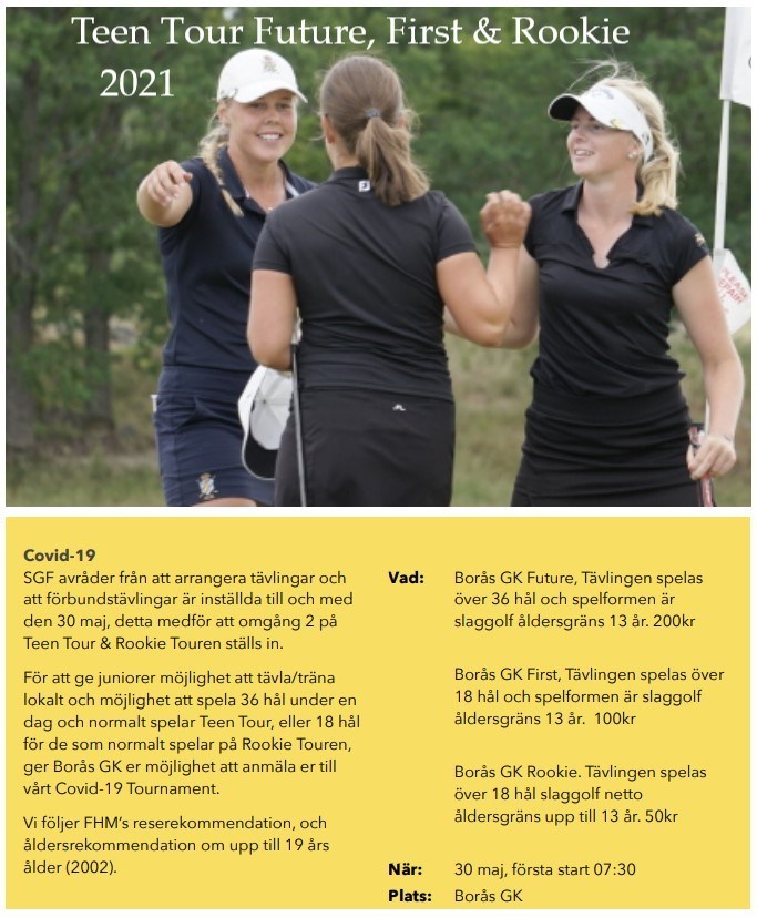 Borås Junior Future, First / Rookie 2021 - Söndag 30.e Maj Nedan följer lite information om vår första tävling för året. Ni anmäler er på Golf.se - Där finns även ytterligare info om tävlingen. Sista dag för anmälan är den 28.e maj. Inbjudan skickas även till våra grannklubbar så det kommer troligtvis bli stort deltagande. Team Brun deltar i B-klass och spelar 18 hål på Södra Banan. Det blir en superfin dag där ni får möjlighet till att komma igång och tävla och träffa juniorer från grann-klubbarna. Hoppas ni har möjlighet att delta! /Knut Bruun. ********** Covid-19 SGF avråder från att arrangera tävlingar och att förbundstävlingar är inställda till och med den 30 maj, detta medför att omgång 2 på Teen Tour & Rookie Touren ställs in. För att ge juniorer möjlighet att tävla/träna lokalt och möjlighet att spela 36 hål under en dag och normalt spelar Teen Tour, eller 18 hål för de som normalt spelar på Rookie Touren, ger Borås GK er möjlighet att anmäla er till vårt Covid-19 Tournament. Vi följer FHM’s reserekommendation, och åldersrekommendation om upp till 19 års ålder (2002). A-klass - Borås GK Future, Tävlingen spelas över 36 hål och spelformen är slaggolf åldersgräns 13 år. 200kr B-klass - Borås GK First, Tävlingen spelas över 18 hål och spelformen är slaggolf åldersgräns 13 år. 100kr C-klass - Borås GK Rookie. Tävlingen spelas över 18 hål slaggolf netto åldersgräns upp till 13 år. 50kr När: 30 maj, första start 07:30 Plats: Borås GK