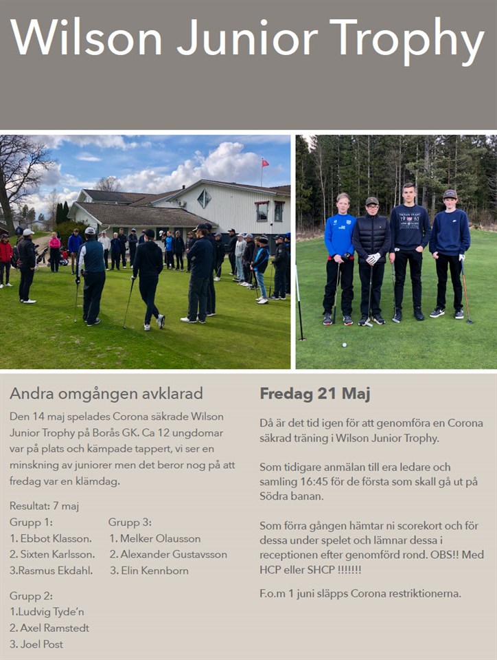 Nedan kommer lite info från förra fredagens drabbning. * Anmälan till mig om ni skall spela på fredag, Mvh, Knut Bruun, 0730-698911, knut@navipro.se Andra omgången avklarad Den 14 maj spelades Corona säkrade Wilson Junior Trophy på Borås GK. Ca 12 ungdomar var på plats och kämpade tappert, vi ser en minskning av juniorer men det beror nog på att fredag var en klämdag. Resultat: 7 maj Grupp 1: 1. Ebbot Klasson. 2. Sixten Karlsson. 3.Rasmus Ekdahl. Grupp 2: 1.Ludvig Tyde’n 2. Axel Ramstedt 3. Joel Post Grupp 3: 1. Melker Olausson 2. Alexander Gustavsson 3. Elin Kennborn Fredag 21 Maj Då är det tid igen för att genomföra en Corona säkrad träning i Wilson Junior Trophy. Som tidigare anmälan till era ledare och samling 16:45 för de första som skall gå ut på Södra banan. Som förra gången hämtar ni scorekort och för dessa under spelet och lämnar dessa i receptionen efter genomförd rond. OBS!! Med HCP eller SHCP !!!!!!! F.o.m 1 juni släpps Corona restriktionerna. Team Utveckling 18 maj 2021 0kommentarer