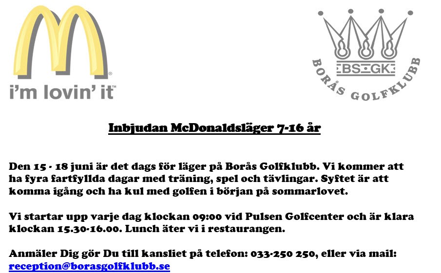 Inbjudan McDonaldsläger 7-16 år Den 15 - 18 juni är det dags för läger på Borås Golfklubb. Vi kommer att ha fyra fartfyllda dagar med träning, spel och tävlingar. Syftet är att komma igång och ha kul med golfen i början på sommarlovet. Vi startar upp varje dag klockan 09:00 vid Pulsen Golfcenter och är klara klockan 15.30-16.00. Lunch äter vi i restaurangen. Anmäler Dig gör Du till kansliet på telefon: 033-250 250, eller via mail: reception@borasgolfklubb.se Målsmans namn: Barnets namn: Barnets personnummer 10 siffror: Adress: Postnummer: Ort: Telefon: Mobilnummer: E-post: OBS! viktigt att meddelande om ditt barn har allergier, mediciner, sjukdomar… Anmälan sker senast tisdagen den 8 juni. Kostnaden för lägret är 795 kronor (inkl. Lunch) och kommer att faktureras. Välkommen med Din anmälan!