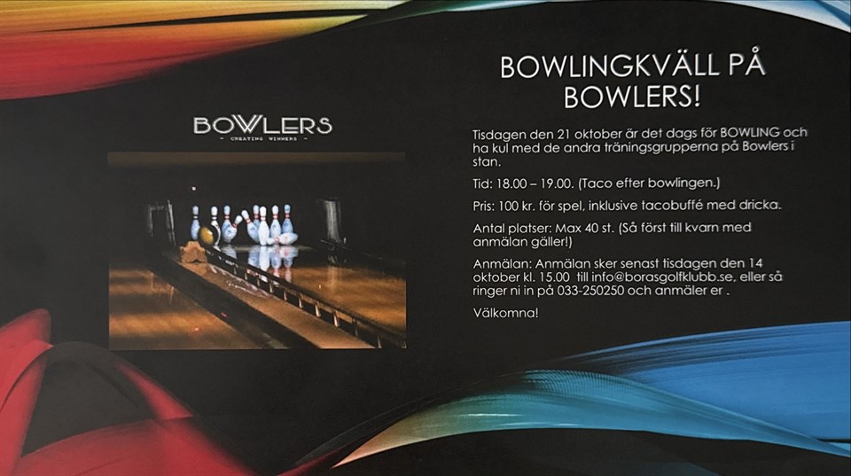Tisdagen den 21 oktober är det dags för den årliga bowlingkvällen med tacos efteråt! Plats: Bowlers Tid: 18.00 (Samling 17.30->) Pris: 100 kr Vi har 40 platser för bowlingen, så först till kvarn med anmälan gäller. Anmälan sker senast den 14 oktober till info@borasgolfklubb.se eller telefon 033-250250. Välkommen med din anmälan! ?🎱 Grupp 2 Tisdag 1 okt 2025 0kommentarer