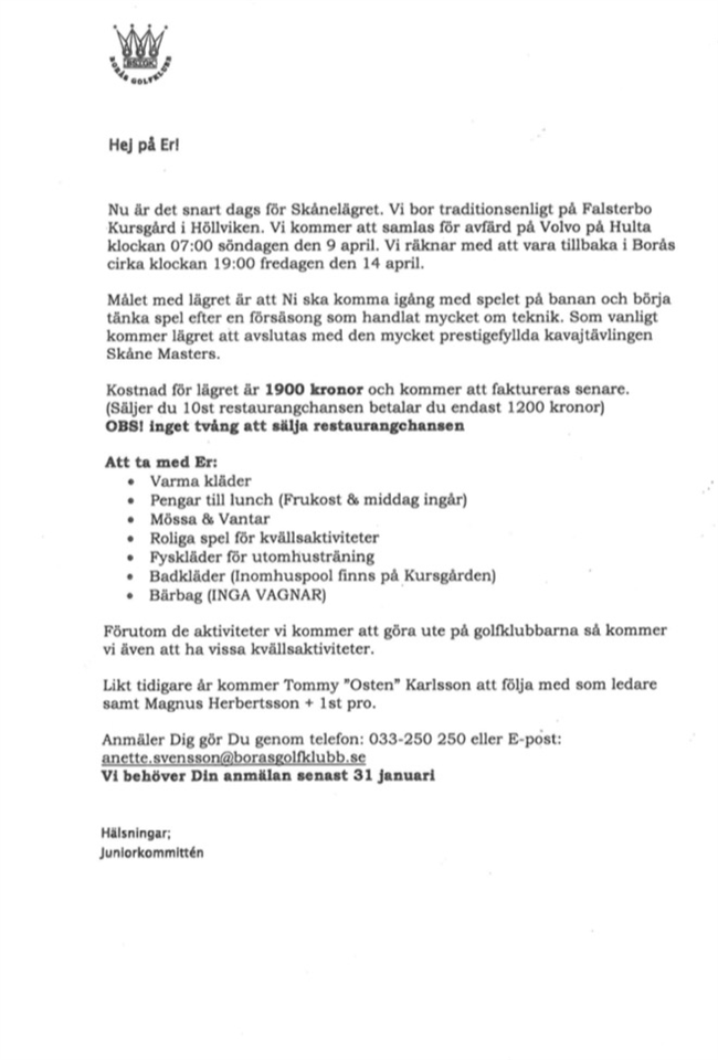Hej! Ni har väl anmält er till spellägret i Skåne!?! En jätterolig upplevelse och en bra start på golfsäsongen! Sista anmälningsdag är 31 januari. Se mer information under fliken bilder. Ni hänger väl med??? / Ledarna genom Therese Team Tjejer 23 jan 2017 0kommentarer