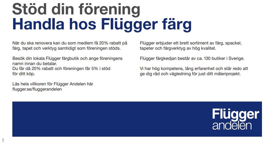 Välkomstbrev / Aktivering av Flüggerandelen. Grattis till att ni aktiverat ett Flüggerandelen-konto. Nu kan era medlemmar ta del av Flüggerandelen-konceptet som ger klubben en ny inkomstkälla baserat på medlemmarnas inköp från Flügger färgbutiken samtidigt som medlemmarna får rabatt. Alla medlemmar kan nu handla på detta inköpskonto och få 20% rabatt på alla Flügger-artiklar i vår lokala Flügger-färgbutik. Medlemmarna anger bara klubbens namn eller kontonummer i kassan. Bullermyrens IK 10 okt 2019 0kommentarer
