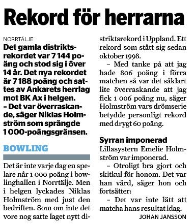 I matchen mot BK Ax hemma den 24 november slog våra a-herrar nytt klubbrekord över 8 serier AM. Det nya klubbrekordet lyder på 7 188 efter serie siffrorna 1 810 - 1 761 - 1 888 - 1 279. Dessa 7 188 är även nytt distriktsrekord över 4 serier AM men det blev även rekord på 3 serier AM med 5 459. De som lyckades sätta nytt klubbrekord var Niklas Holmström - 1 006 Mathias Sollenhag - 971 Mathias Andersson - 963 Tord Sjöberg - 900 Stefan Bonell - 886 Peter Tidbeck - 826 Peter Wihlborg - 822 Stefan Jansson - 814 Anders Ellne Matchfakta