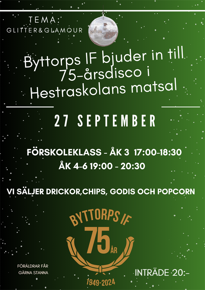 På fredag bjuder Byttorps IF in till 75-årsdisco i Hestraskolans matsal! Vi ses där!