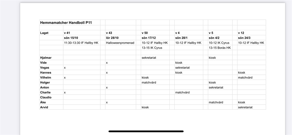 Hej, Matcherna som skulle spelas v 50 blev inställd och kommer att spelas kommande helg. Det betyder att de föräldrar som skulle vara i sekretariatet, kiosken och matchvärd vecka enligt schemat nu får vara det på söndag istället. Skulle det vara så att ni inte kan, vänligen byt med varandra. Dokumentet hittar ni på själva sidan på P11 under dokument - handboll P11- schema hemmamatcher. Med vänlig hälsning Malin Handboll P13 14 jan 2024 6kommentarer