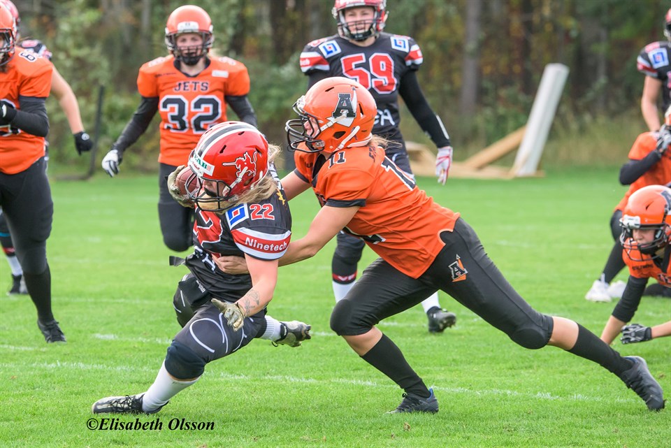 Superserien 2021 såg länge ut att bestå av fem lag, men på grund av att pandemin försvårat tränig och rekrytering har Västerås Roedeers och Arlanda Jets tvingasts kasta in handduken och dra sig ur seriespel. Västerås har valt att kliva tillbaka ner i division 1 medan Arlanda valt att inte spela alls under 2021. Detta har medfört att spelare sökt sig till andra klubbar för spel och en av dessa är vårt senaste tillskott, Hedvig Palocci, närmast från Arlanda Jets. Hedvig gjorde sin första säsong 2016 i Superserien, då i Arlanda Jets. Efter det blev det spel i Stockholm Mean Machines men även Carlberg Cavaliers i Universitetsligan. Vid sidan av tacklingsfotbollen har hon även spelat flaggfotboll i Arlanda, Uppsala och Carlberg samt representerat landslaget i både tacklingsfotboll och flaggfotboll. 2020 var hon tillbaka i Arlanda Jets där allting startade för sex år sedan. Hon har spelat på en rad olika positioner i försvaret men har fått mest speltid i både klubb- och landslag som safety. Foto: Elisabeth Olsson