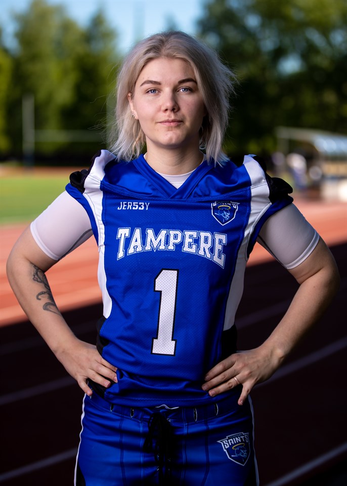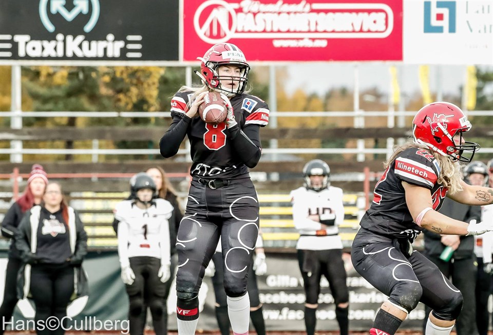 Efter beskedet om att fjolårets succéquarterback Sydney Green inte kom till spel i år har det varit febril verksamhet i Crusaders för att hitta en ersättare. Ett av kännetecknen för Crusaders quarterbacks dom senaste åren har varit en kombination av storlek, speluppfattning och armstyrka i både Linda Johanssons 182 cm och Sydney Greens 177 cm. Nu har ersättaren hittats och det blir ett välkänt ansikte för dom som följt internationell fotboll dom senaste åren. Med sina 179 cm och åtta års erfarenhet kommer finländska Emilia Räty hjälpa Crusaders anfall under 2021. - Emilia är bra skolad och har en lång erfarenhet av spel på hög europeisk nivå. Hon har även ett spelsätt som passar in i vårt system och som kommer ge henne möjlighet att snabbt anpassa sig även om det kommer va minimalt med förberedelsetid, säger huvudtränaren Chrsitian Forsman. Precis som i fallet med värvningen av Sydney Green förra årets har huvudtränaren Christian Forsman varit drivande i sökandet efter en ersättare. - Det fanns egentligen två alternativ att välja på efter att Sydney inte hade möjlighet att återvända. Antingen flytta tillbaka Linda Johansson som quarterback och därmed tappa henne som vapen i receivergruppen eller försöka hitta en ny quarterback som besitter en kvalité som kan motivera att behålla Linda i nuvarande roll, säger Christian Forsman och fortsätter: - Det är enligt mig ett väldigt begränsat utbud av lämpliga quarterbacks på marknaden men jag tycker ändå att vi lyckats knyta till oss det bästa alternativet som fanns tillgängligt. Vår målsättning är att se till att vara som bäst när det gäller i slutet av säsongen, och jag är övertygad om att vi kommer få ihop det. Emilia Räty började spela amerikansk fotboll 2014 i Tampere Saints och det är fram till idag enda klubblaget hon representerat. Redan efter två år slog hon sig in i landslaget och 2019 ledde hon laget till ett EM-guld. - Mina två största bedrifter hittills är vinsten i europamästerskapet och när vi i Saints lyckades ta oss till final i Vaahteraliiga 2020, trots att vi inte knep guldet, säger Emilia Räty. Innan hon anländer till Sverige och Karlstad ska Emilia spela klart säsongen med moderklubben Saints. - Jag är fast övertygad om att vi kan vinna hela division 1 i år efter en bra start på säsongen, säger Emilia Räty. Foto: Jari Mäki-Kuutti