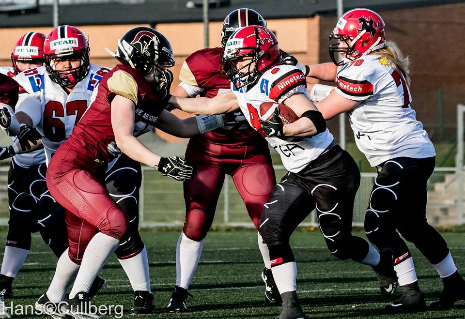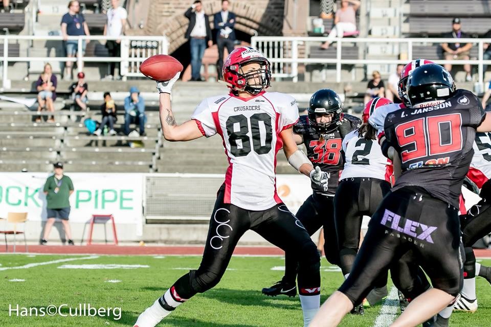 Rysaren på Regementets IP Då var hemmapremiären avklarad, och det slutade i dur även om det länge såg mörkt ut för Crusaders. Arlanda inledde starkt och lyckades skapa en ganska stabil ledning innan halvlek och gick till vila med ledning 16-6. – Precis i början av matchen lyckas vårt försvar stoppa Arlandas anfall och på efterföljande drive lyckas vi driva bollen hela vägen ner till Arlandas sjätte yardlinje. På efterföljande spel tappar vi bollen precis utanför endzone och en Arlandaspelare plockar upp bollen och det renderar i Arlandas boll på 20 yardslinjen istället för sex poäng till oss. Därefter gör vårt försvar återigen i bra jobb med att stoppa Arlandas framfart, men dessvärre tappar vi bollen under punt returen och Arlanda får återigen tillbaka bollen. På efterföljande drive lyckas dom göra matchens första touchdown och ta ledningen med sju poäng. Eftersom Arlanda höll liv i sina driver och vi schabblade med bollen fick vi bara till en drive under hela första kvarten. Och i andra kvarten spelar vi i ganska kraftig motvind och det satte käppar i hjulet för oss. Jag får ta mig ansvaret för den dåliga produktionen framåt i och med att det är jag som kallar spelen. Säger huvudtränaren Christian Forsman. Efter halvtidsvilan klev ett fokuserat hemmalag ut på planen och gjorde 28 obesvarade poäng för att slutligen vinna med hela 34-16. En av bidragande faktorerna var att Crusaders lyckades ta bollen från Arlanda hela fyra gånger under andra halvlek genom två interceptions och två upplockade fumbles. I tre av fyra fall gjorde Carlstad poäng på de efterföljande driverna. Trots att det blåst kraftigt på Regementets IP dagen till ära anföll bägge lagen friskt genom luften. Crusaders Linda Johansson passade bollen inte mindre än 31 gånger och drygt hälften av bollarna fångades av av Crusaders receivers. Två av lagts totalt fem touchdowns gjordes genom luften av Karin Ullén och resterande tre sprangs in. För dessa tre stod Linda Johansson, Anna Hedström och Karin Ullén. Carlstad lyckades förvalta två av fem extrapoängs försök där Linda Johansson och Anna Hedström sprang in var sin tvåpoängare. – Vi kommer ut som ett nytt lag efter halvlek och får bra utdelning redan på första spelet och kunde reducera direkt. Turnovers visade sig viktiga även i denna match och vi kunde trumma på i tredje kvarten med vinden i ryggen och vända momentum och rida ut stormen till 34-16. Jag är imponerad över hur tjejerna lyfter sig i andra halvlek och spelar betydligt mer fysiskt. Vi går nu in i en längre vila och kan plåstra om småskador och finjustera i spelsystemen. I helgens match kom vi till spel med nästan komplett trupp och saknade endast Elin Skoog, Marcela Wattring och Jenny Widding. Vi hoppas dock att vi får tillbaka långtidsskadade Elin Skoog redan till nästa match. Vi har även fått tillbaka Josefin Johanzon som gjorde comeback och kunde avlasta en hel del i försvaret vilket gjorde att vi kunde ha fräschare spelare på planen under hela matchen. Säger huvudtränaren Christian Forsman. Resultat 34-16 (0-7, 6-9, 22-0, 6-0) Poänggörare Karin Ullén 18p Linda Johansson 8p Anna Hedström 8p Poängligan Crusaders 2019 Karin Ullén 42p Anna Hedström 22p Linda Johansson 10p Emma Sandsjö 8p Moa Hansson 6p Elin Thimfors 6p