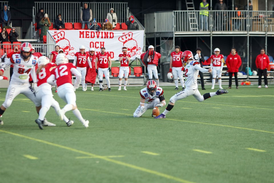 Det skulle krävas övertid, ett starkt defense och en kylig 17-åring för att fixa Carlstad Crusaders första seger i Superserien för herrar. Tyresö Royal Crowns kunde besegras med 10–7 (0–0) på Tyresövallen. – Känslan när den avgörande sparken gick in kan jag inte sätta ord på, säger Albin Forsman. Det är en stor generationsväxling som Carlstad Crusaders genomgår säsongen 2022. Truppen innehåller en lång rad talangfulla 17 och 18-åringar som kommit upp genom föreningens ungdomslag. Och många har verkligen fått kasta sig rakt ut i hetluften. Det gäller inte minst Albin Forsman! I premiären mot Örebro Black Knights klev Forsman, som under ungdomsåren varit quarterback, in som wide receiver och kicker. Mot Tyresö Royal Crowns fick han axla ett stort ansvar när amerikanske quarterbacken Timothy Morovick inte kom till spel. Det innebar att Forsman fick kliva in på en bekant position, men för första gången i Superseriesammanhang. Forsman visade upp ett imponerande lugn och efter en poänglös första halvlek lyckades han i andra hitta fram till Kevin Börzsei med sin första touchdownpassning i Superserien. Han sparkade sedan själv in extrapoängen fram till 7–0. – Albin spelade oerhört smart med bollen och visade dessutom att han kan få saker att hände genom att springa själv med bollen. Han tog verkligen uppgiften som ett proffs, säger Daniel Holmgren, head coach i Carlstad Crusaders. – Det var extremt roligt och jag är väldigt tacksam att ha fått förtroende från både coacher och lagkamrater som gjort detta möjligt. För min del har det varit en stor utmaning då jag under hela försäsongen varit inställd på att spela receiver och nu på en vecka förbereda mig på att gå in som QB. Men jag tänker inte backa från en utmaning och Tim har gjort ett superjobb med att coacha mig och gjort mig förberedd till matchen, säger Albin Forsman. Tyresö lyckades kvittera matchen, men Crusaders fick läge att avgöra. Med bara några sekunder kvar på klockan fick just Albin Forsman möjlighet att sparka in sitt tredje field goal för säsongen, men 41-yardssparken var aningen för långt åt höger. Matchen fick avgöras genom övertid. Carlstad Crusaders defense lyckades stoppa Tyresö och Crusaders och Albin Forsman fick en ny möjlighet att avgöra med ett field goal och den här gången seglade bollen in mellan stolparna. – Det var en väldigt tajt match från start och det var även det vi förväntade oss. Vårt defense gör ett extremt bra jobb matchen igenom och håller oss kvar i matchen efter en liten seg start från offense i början, säger Albin Forsman. Vad säger du om din egen match? – Jag är som helhet nöjd med min insats. Hade gärna sett att vi kunde fått upp mer poäng på tavlan och tagit vara på de turnovers som defense skapade. Men det gäller att kliva fram när det gäller som mest och känslan när den avgörande sparken gick in kan jag inte sätta ord på. Carlstad Crusaders defense spelade bra hela matchen, inte minst genom att sätta riktigt hård press på Tyresös quarterback, förre Crusadersspelaren, Philip Juhlin som gick ner i backen flera gånger under matchen. – För andra matchen i rad så svängde momentum i matchen mot oss, men den här gången klev grabbarna fram och knöt ihop säcken. Vi utvecklas mer och mer och ser fram emot Stockholm nästa helg, säger Daniel Holmgren. Stockholm Mean Machines är än så länge Superseriens enda obesegrade lag (två vinster), medan Crusaders, Royal Crowns och Black Knights står på en seger var. Foto: Håkan Bylund