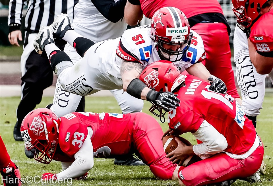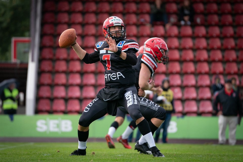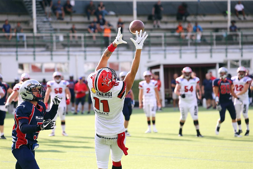 Q1 6–0: Jacob Bergwall (13 yd pass from Alf Ransjö) 7–0: Alexander Segerfeldt Q2 7–6: Demmy Agbabiaka (8 yd run, J Cafferky Jr kick blockd) Q3 – Q4 13–6: Jacob Bergwall (28 yd pass from Danny Farley) 14–6: Alexander Segerfeldt Komplett statistik från matchen
