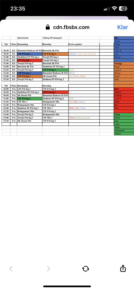 Här kommer spelschemat där ni ser vika matcher era barn spelar. Alla har förutom två ordinarie matcher varsin extramatch. Antingen med en av våra ordinarie matchgrupper eller i mixlagen som vi har tillsammans med vårt tjejlag födda 2016 under cupen. Vill man inte spela en extramatch så hör av er INNAN lördag. Det finns gott om spelare som vill spela. Vi vill ha spelsugna grabbar på matcherna :) Kom ihåg fotolappen till lördag 14:30 då vi ska fotas! Vi hoppas grabbarna kommer få en härlig lördag med många roliga aktiviteter förutom själva fotbollen då :) Finns en Pdf under dokument-Full Fräs den syns lite bättre än denna bild. /Isak