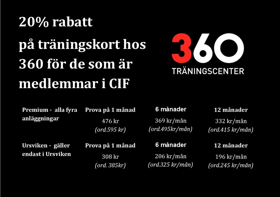 Alla CIF:s medlemmar får 20% rabatt på ett träningskort . Erbjudandet gäller för träningskort på alla fyra av 360:s anläggningar. Till de som är medlemmar räknas de som har betalat medlemsavgift 2016 samt upp till 4 tränare/ledare per lag. Man får börja träna på 360 från 10 år i målsmans sällskap. Alla som vill utnyttja detta supererbjudande får komma till kansliet för att hämta sitt medlemskort. När ni hämtar ert medlemskort kommer vi att dubbelkolla att medlemsavgiften är betald. Är ni osäkra så kontakta Stina på kansliet på cif.stina@telia.com. För de som inte redan är medlemmar i CIF finns möjlighet att bli stödmedlem. Det kostar 150 kr. För att bli stödmedlem så swishar du 150 kr till nr: 123 156 98 47. Det är jätteviktigt att du skriver "Stödmedlem" och personnummer i meddelanderutan. Du visar sedan upp din swishbetalning för personal på 360 när du köper ditt träningskort. Det går även bra att komma till kansliet och betala om man inte har swish. Man får då ett vanligt medlemskort. Medlemskap i CIF gäller årsvis. Ni som är och blir medlemmar nu under 2016 är det fram till årsskiftet. Så se till att använda er av detta erbjudande innan december är slut. Priser: Premium - alla fyra anläggningar Prova på 1 månad 476 kr (ord.595 kr) 6 månader 369 kr/mån (ord.495kr/mån) 12 månader 332 kr/mån (ord.415 kr/mån) Priser: Ursviken - gäller endast i Ursviken Prova på 1 månad 308 kr (ord. 385kr) 6 månader 206 kr/mån (ord.325 kr/mån) 12 månader 196 kr/mån (ord.245 kr/mån) A-lag Herrar 19 sep 2016 0kommentarer