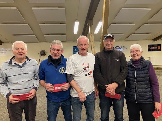 Vinter Cupen – slutresultat Inför 10:e och sista omgången av Vinter Cupen var det riktigt spännande i toppen. Vem som helst av de som befann sig på plats ett till sju kunde vinna. Vi spelade tre spel på raken (denna gång enbart dubblar) och sedan var det dags för kaffe och smörgås – som var gratis denna dag – under fikat räknades slutresultatet ut. Prisbordet bestod av presentkort från ICA där de fyra första fick något högre belopp och sedan lottades det också ut ett antal kort. Våra seniorer uppskattade att vi tävlar då och då istället för ”bara” träning. Så vi räknar med en ny omgång – Vårboulen – som börjar i februari nästa år, vi sätter upp anmälningslistorna i mitten av januari. Grattis säger vi till 1:a Kjell Lindman 2:a Torild Nyman 3:a Håkan Andersson 4:a Anette Eriksson/Svenna Larsson God Jul och Gott Nytt År! // Carin, Pia, Kjell och Sandolf Text och bilder från Pia Tack så mycket för julgåvan som Charles levererade till mig. Önskar alla en riktig God Jul och Gott Nytt År. Carin Hela resultatlistan finns under dokument.