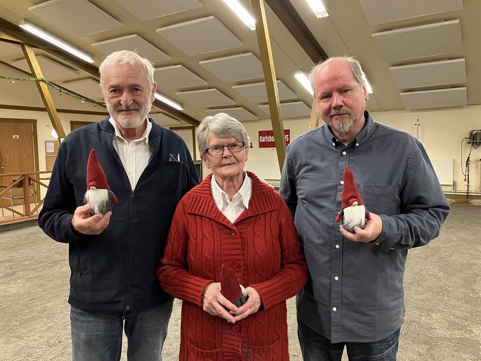 Tomteboulen - 11 december 2022 Det var dags för årets ”Tomteboule” klockan var två och doften av glögg mötte alla 57 förväntansfulla boulespelare denna 3:e söndagen i advent. Ute var det snö och bitande kallt, skönt att komma in i värmen… När vi kom in i boulehallen - som var vackert julpyntad – köpte vi lotter till vinlotteriet som Conny ordnat med, vi lämnade in vår julklapp som skulle lottas ut lite senare…men först var det dags för glögg och den årliga tipspromenaden, Sandolf hade fixat riktigt kluriga frågor… Ordf Micke hälsade alla välkomna och efter det var det dags för boulespel, totalt 3 Monrad – Emelie och Pia hade lottat tidigare och lagt in i datorn. Efter första spelet fick vi sätta oss till bords och njuta av en jättegod julsmörgås som Marianne, Gerd, Yvonne, Ulrika, Britt och Birgitta hade gjort i ordning till oss. Vinnarna av KM och Punchpokalen fick sina priser och välförtjänta applåder. Sandolf gick igenom de rätta svaren på tipspromenaden, grattis till Tord Andersson som lyckats svara rätt på flest frågor. När vi spelat andra spelet var det dags för kaffe o lussekatt. Emelie och Pia delade ut julklappar - efter att namnet ropats ut fick man gå fram och välja en från den jättelika julklappshögen. Efter sista spelet var det dags för vinlotteriet och prisutdelning för bästa spel till 1:an i dagens tävling… Grattis till dagens vinnare 1:a pris Gerd Landelius, Mikael Gustafsson, Bernt Svensson Eftermiddagen har bjudit på god mat och många glada skratt… God Jul och ett stort tack till alla som möjliggjort denna dag Bilder finns i ”bildgelleriet” Text och bilder från Pia