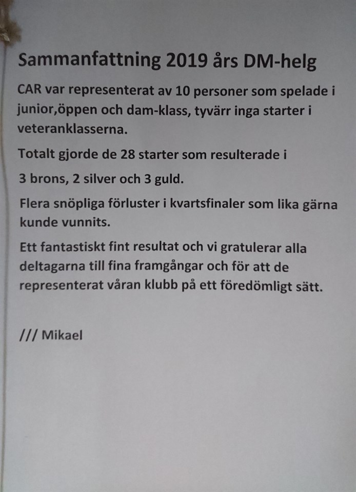 Idag var några stycken från vår klubb som spelade Tibrocupen. Det är en V55 dubbel mix. När vi kom till Tibro hängde regndropparna i luften, men det klarnade upp. Vi som åkte var Anita-Stig-Bertil, Marianne-Bernt, Eivor-Bosse och Carin som spelade med Bengt-Åke Fors. Resultaten varierade för lagen och det lag som klarade sig bäst var Marianne och Bernt. De hamnade på 3:dje plats utav totalt 24 lag. Carin 190521