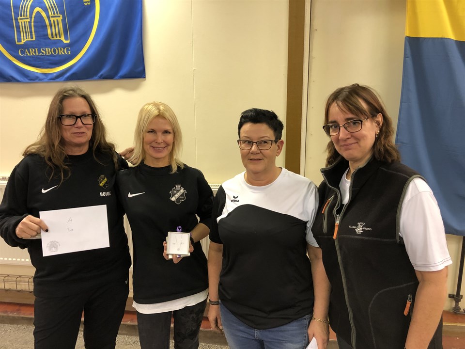 Desideria 10-11 november 2018 Lördagen var det dags för dubbel och det var 19 lag anmälda. Tyvärr lyckades vi inte få fram ett lag till, så i grundspelet var det lag som fick wo. 3 lag från vår klubb var anmälda.. Det spelades 4 monrad på tid ca 40-45 minuter. Däreter började slutspelen. 8 lag till A-slutspel och 8 lag till B-slutspel och 3 lag som spelat färdigt för dagen. Första pris i A-slutspelet var ett smycke som bestod av halskedja med tillhörande örhängen. Det delades även ut penningpriser till de 4 bästa lagen. Vi säger GRATTIS till: A-slutspel 1a Helene Palovaara Di Telia AIK, Annelie Westin AIK 2:a Marie Nordh BKS, Annelie Behring BKS 3:a Ulrika Alstander TPC, Monica Eriksson LEJ 3:a Anna Jonsson TIB, Birgitta Nilsson TIB B-slutspel 1:a Åsa Lindberg TIB, Monica Andersson TIB. 2:a Lindali Andersson TBF, Carola Andreasson TIB Tävlingsledare för dagen var Thomas Persson och till sin hjälp i sekretariatet fanns Tom Hansen. Domare Mikael Gustavsson Kiosken bemannades av glada herrar som såg till att spelarna hade möjlighet att köpa allt från kaffe till lite matigare som hamburgare och korv. Söndagen var det dags för trippel. Här var det 16 lag anmälda. Idag representerades vår klubb av 4 lag, varav ett är värt att nämna lite extra. Det laget bestod av våra unga tjejer Alva Hansen-Grip, Alice Källström och Emelie Källström. De hade många åskådare och de drog ner många applåder när lägg och skytte fungerade. Alla tre jätteduktiga. Med tanke på vilket motstånd de hade, då det var många bra och rutinerade lag anmälda idag, så är det bara att säga BRA JOBBAT TJEJER!!. Även här spelades det 4 monrad på tid. Då det var 16 lag anmälda blev det 8 lag till A och 8 lag till B slutspelen och alla fick spela minst 5 matcher. Även här fanns det smycken - halskedja med tillhörande örhängen till det lag som tog sig till 1:a platsen. Givetvis penningpriser till 4 bästa lagen. GRATTIS till A -slutspel 1.a Monica Eriksson LEJ, Ulrika Alstander TPC, Annelie Behring BKS 2:a Lena Andersson TIB, Maria Gustavsson TIB, Susanne Mälberg TIB 3:a Camilla Csapó Olsson SCP, Maria Wallman BKS. Marie Nordh BKS 3:a Ann-Lis Svensson BON, Inga-Lisa Corell-Sällberg BON, May-Britt Andersson SKA Dagens tävlingsledare Tom Hansen och Thomas Persson hjälpte till i sekretariatet. Mikael Gustavsson var även idag domare. Kiosken var idag bemannad med en massa glada herrar. Ingen av spelarna behövde gå hungriga då det fanns mycket att välja på. Tack alla spelare och övriga för att ni gjorde helgen trevlig med spännande matcher och social samvaro. En del spelare kom långväga ifrån och hade kört många mil för att komma till Karlsborg för att spela hos oss.. Hoppas att vi ses nästa år igen. Det finns en film på Youtube som Bengt-Jonas tog under lördagen. Sök på Youtube - Desideria bouletävling 2018. Carin 181112