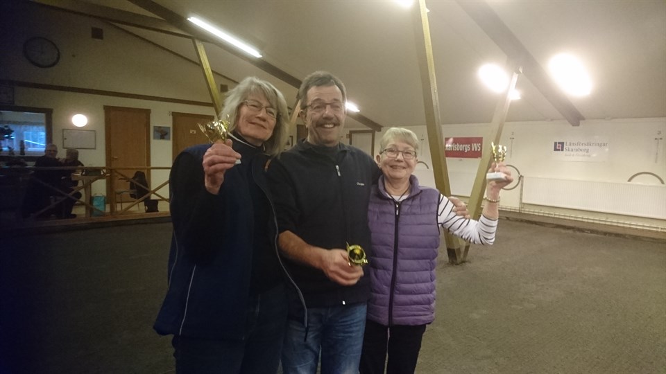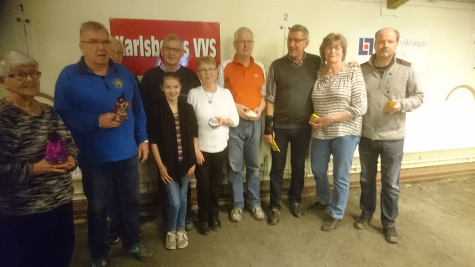 Spännande in i det sista. Inget lag var klar vinnare innan dagens och sista omgången i Vinterspelen avgjordes. Rolf och Sandolf har varit arrangörer för denna serien. Den startade i september och därefter har lagen träffats varannan tisdag för att göra upp om placeringarna. Det har spelats 12 möten med 3 omgångar i varje, förutom i 2 möten där det spelades 4 omgångar. Alla har mött alla vid 2 tillfällen. Vinterspelen har arrangerats i ganska många år och det är Hjo och Karlsborgs klubbar som spelat. Lagen har lottats ihop i tripplar och består av minst en spelare från vardera klubb. Prisutdelning hölls och vi säger GRATTIS till 1:a Lag nr 4 - Sonja Andersson, Marieanne Gustavsson och Christer Woxlin 28 vinster 129 kvot 2:a Lag nr 5 - Astrid Andersson, Ann-Marie Andersson och Stig-Bertil Johansson 27 vinster 119 kvot 3:a Lag nr 10 - Birgit Magnehed, Helfrid Uvholm och Anders Ståhl 26 vinster 102 kvot Då det var väldigt jämt så kommer även resultaten på 4:a Lag nr 7 - Anna-Maj Nylén, Margot Hellqvist och Håkan Johansson 25 vinster 110 kvot 5:a Lag nr 6 - Annette Eriksson, Anita Persson och Klas Johansson 25 vinster 35 kvot Namnen är på ordinarie spelare Sluttabellen finns att beskåda under dokument - Vinterspelen. Rolf och Sandolf förärades var sin blomma som överlämnades av Berit och Bibbi. Bibbi höll ett litet tal och tackade Rolf och Sandolf för allt arbete de hade lagt ner. Bengt-Göran från Hjoklubben tackade också och sa bl.a. att det var trevligt att komma till Karlsborg och spela boule. Här ger vi även ett stort tack till staben i köket som mestadels har bestått av Birgitta, Ann-Marie, Rune och Solveig. De har sett till att det funnits kaffe och tilltugg vid alla speltillfällen. Dagen till ära blev alla deltagarna bjudna på kaffe och landgång med en massa gott på. Under tiden alla drack sitt kaffe jobbades det i sekretariatet med att räkna fram resultaten. Intresse fanns för att fortsätta med serien, så vi ses fram i höst igen hälsar Rolf och Sandolf. Carin 20180313