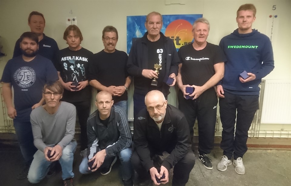 Börjar med lite kuriosa. Den första Företagsboulen genomfördes år 2002-2003. Då var det 8 lag anmälda. Vinnare det året var VVS. Åren efter ökade lagens antal till 14, 18 och därefter till 20. Då denna tävling spelas inomhus, så är det max 20 lag vi kan ta emot. Nu var det dags att göra upp om vilket lag som skulle ta hem vinsten i årets Företagsboule. De 20 lagen har spelat varannan tisdagskväll från början av oktober tills nu. 13 omgångar har spelats, med ett litet juluppehåll. Alla lagen har mött varandra 2 gånger. 3 matcher har spelats varje gång förutom i kväll då det var 2 matcher som gällde. Det var en riktig rysare. Innan dagens spel hade Brodit och Stens Byggtjänst 29 vinster. De var klara att spela om 1:a och 2:a plats. Vilket lag skulle då till sist knipa den sista pallplatsen? Här hade vi 3 stycken lag som hade möjlighet att nå bronsplatsen. Team Snestuds 26 vinster och Karlsborgs VVS och Vanäsverken med sina 25 vinster. Efter att matcherna spelats klart bjöd klubben alla spelare på fika. Under tiden detta intogs så var det lite arbete i sekretariatet att räkna fram resultaten. Klubbens ordförande Mikael lämnade över priserna till de vinnande lagen. Från och med i år har vi även en vandringspokal som det vinnande laget får "låna" i en säsong. Det lag som lyckas få 3 stycken inteckningar i vandringspriset får behålla det. Vi säger GRATTIS till 1:a Lag 19 Brodit 30 vinster 201 kvot 2:a Lag 12 Stens Byggtjänst 30 vinster 152 kvot 3:a Lag 11 Team Snestuds 27 vinster 130 kvot 4:a Lag 13 Vanäsverken 27 vinster 97 kvot Resultatlistor och slutspelstabell ligger under dokument företagsboulen. Sandolf tackade alla damer i kiosken som sett till att det funnits både korv, kaffe, mackor och annat gott för alla vid alla speltillfällen. De förärades med en rungande applåd från alla närvarande. Nu får vi vänta på våren och sommaren innan det dags igen framåt hösten. På återseende Carin, Sandolf och alla andra som hjälper till för att få tävlingen att fungera.