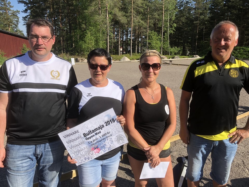 Det var en helt fantastisk dag med strålande sol, bra boule, många lag och härlig stämning när årets Bultamaja (öppen mixed dubbel) arrangerades. Totalt var det 28 lag som gjorde upp om det och lagen delades i 4-lagsgrupper. Startfältet bestod av en härlig blandning av olika åldrar från landslagsspelare till nybörjare. Vår klubb hade 5 ½ lag till start och bäst av våra lag gick det för Anita och Jörgen som slutade som 2:a i B-slutspelen. Det var många matcher med riktigt bra spel under dagen och speciellt mellan Kennet Larsson/Angeliqa Söder BKS och Patric Larsson/Marie Nordh CPC/BKS som både var spännande och mycket välspelad. Till slut gick Patric och Marie segrande ur striden med 13-12. I den andra semifinalen så vann Lars Hesse/Jenny Jönsson TRX över Anette Rudin/Lucas Rudin SÖR. Trixarna imponerade stort under hela dagen. I finalen så visade Patric och Marie klass och vann ganska komfortabelt även om Jenny och Lars spelade bra. Vi gratulerar Patric Larsson/Marie Nordh till vinsten i Bultamaja 2018 som förutom prispengar även bestod av fritt deltagande vid Bultamaja nästa år. Resultat A-slutspel 1.a P Larsson/M Nordh CPC/BKS 2.a L Hesse/J Jönsson TRX 3.a L Rudin/A Rudin SÖR 3.a K Larsson/ A Söder BKS 5.a L Johansson/A Jonsson BKS 5:a A Claesson/R Claesson BON 5.a A Behring/K Karlsson BKS 5:a A Bergström/M Bergström LEJ Resultat B-slutspel 1:a C Johansson/S Johansson BON 2:a J Lungberg/A Persson CAR 3:a L Andersson/B Sjögren TBF/CAR 3:a L Karlsson/S Mälberg TIB Tävlingsledningen tackar alla deltagare, publik, funktionärer och domare Bertil Tunje för en trevlig dag på gruset i Karlsborg. Text och bild från Tom Bilder inlagda album Bultamaja. Tackar Bernt för alla bilder