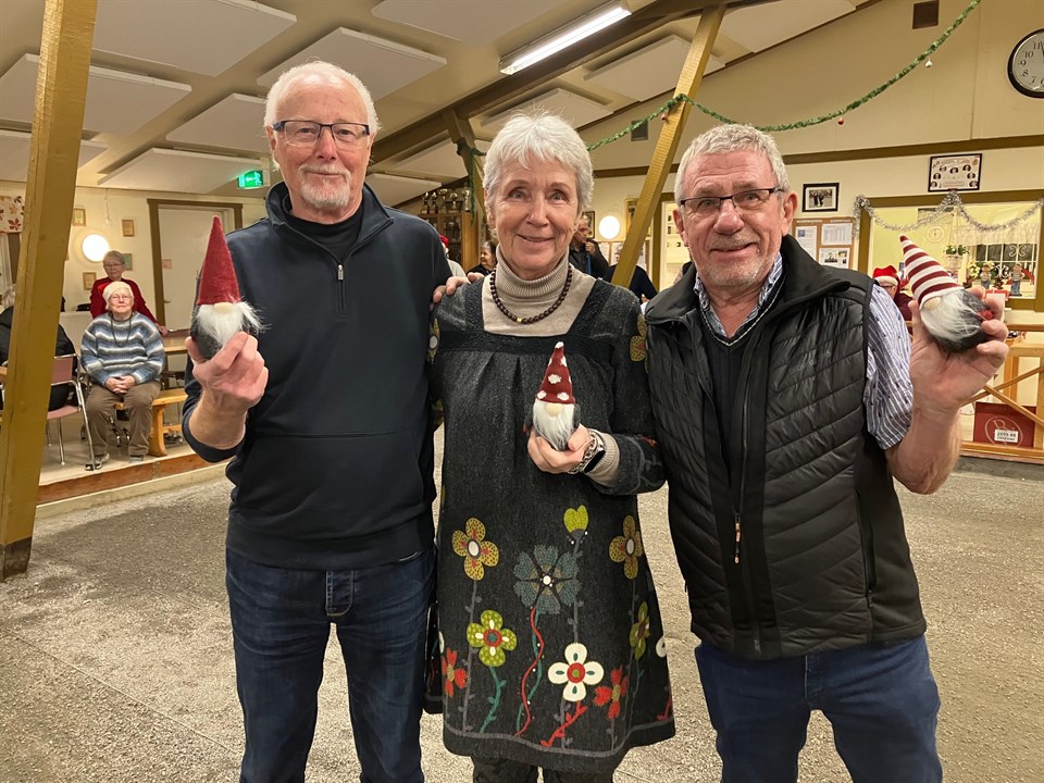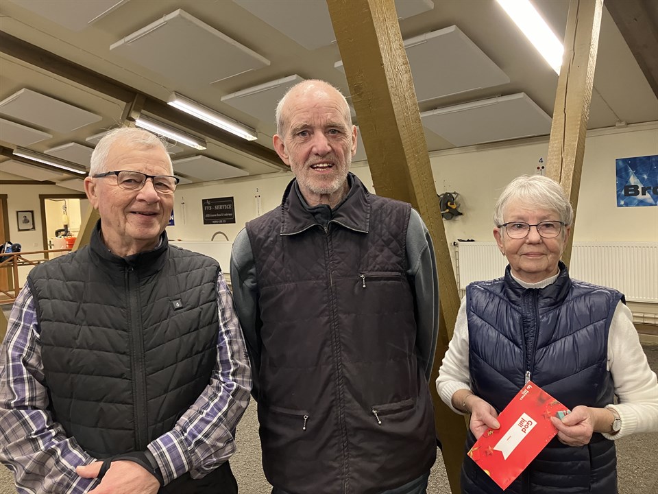 Avslutning Vinter Cupen 2023 Vinter Cupen – slutresultat Inför 11:e och sista omgången av Vinter Cupen var det inte lika spännande i toppen som det burkar, men när det gäller tvåan till fyran så var det många som ville vara med och slåss om de åtråvärda platserna. Vi spelade tre spel på raken (både tripplar och dubblar) och sedan var det dags för kaffe och smörgås – som var gratis denna dag – under fikat räknades slutresultatet ut. Prisbordet bestod av presentkort från ICA där de fyra första fick något högre belopp och sedan lottades det också ut ett antal kort. Våra seniorer uppskattade att vi tävlar då och då istället för ”bara” träning. Så vi räknar med en ny omgång – Vårboulen – som börjar första torsdagen i februari nästa år, vi sätter upp anmälningslistorna i mitten av januari. Grattis säger vi till 1:a Bengt-Åke Fors 2:a Lennart Roos 3:a Marianne Gustafsson 4:a Bernt Gustafsson God Jul och Gott Nytt År! // Carin, Pia, Kjell Vi tackar för den fina uppvaktningen.