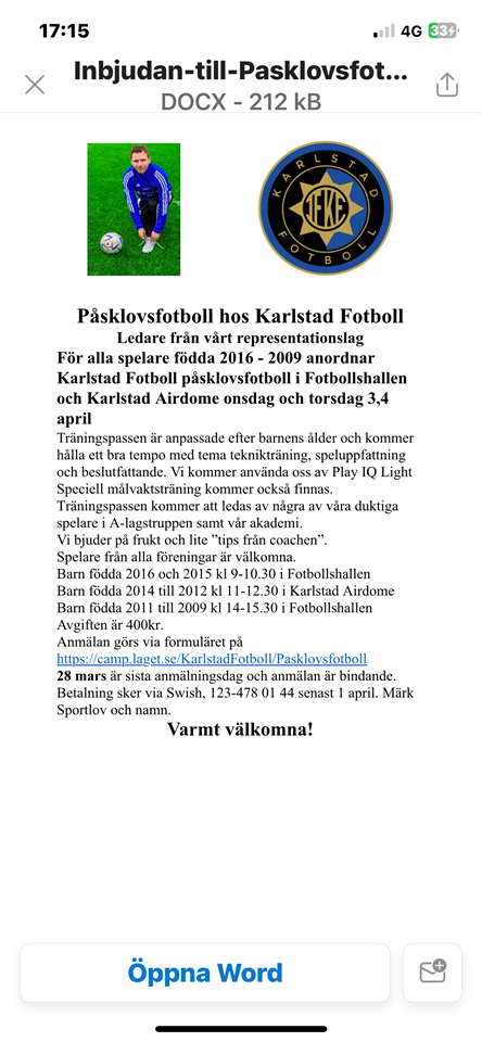 Det finns möjlighet att vara med på fotbollsläger under påsklovet. Se nedan 😊 Elvin är anmäld. https://www.karlstadfotbollungdom.com/Page/452630 P-13 14 mar 2024 1kommentar