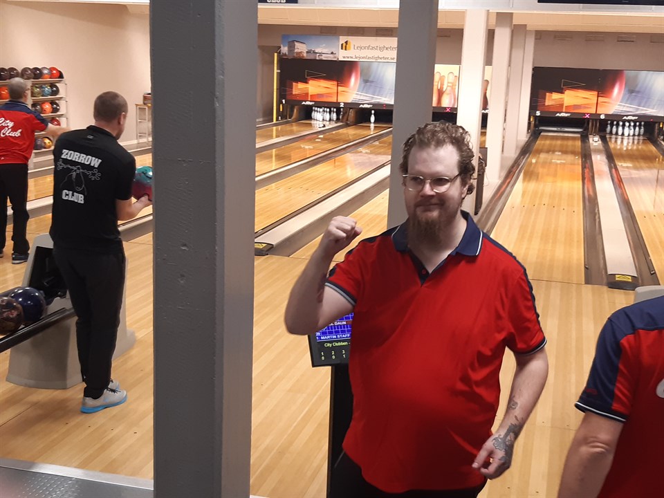 Söndagens Sporthallsderby mellan CIty/Zorrows och Team Linköpings reservlag blev en omväxlande tillställning som slutade med delad pott. Team Linköping öppnade bäst och ledde i halvtid med klara 7-3. City/Zorrow vägrade dock att ge sig. Först blev det 3-2 i tredje rundan och sedan 4-1 i sista rundan efter dagens bästa omgång på 1361 poäng vilket betydde att matchsiffrorna spikades till 10-10. I kägelpoäng hade City/Zorrow 5176 mot Team LInköpings 5059. City hade en stark representation.. Bästa Cityspelare blev Daniel Daun med 745 poäng.närmast före Roger Gustavsson med 741. Bosse Jonsson och Uffe Fredriksson hade båda 646. Främste Zorrowspelare var Anders Karlsson som även han noterades för 646, matchens i särklass mest populära resultat./Js BILD Daniel Daun söndagsbäst i City/Zorrow