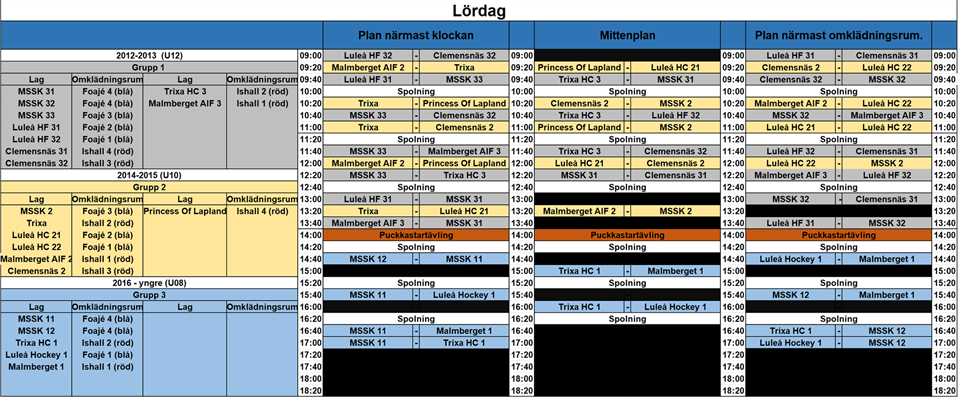 Välkomna till Tjejligan i Piteå. Vi tillhör grupp 2 och går under namnet Clemensnäs HC, Lag 2 (Clemensnäs 2) och verkar ska hålla till i ishall 3 (röd). Laget Vi har delat upp oss i 2st grupper för att ge så kvalitativ speltid som möjligt. (Undantag målvakter som är med i båda grupper då de är utespelare också). Grupp 1 Junie V (målvakt) Alex Evie Cornelia Wilma Esther Alina Grupp 2 Alina (målvakt) Meja Nelly Celina Melina Rachel Junie V Spelschema Grupp 1 - Samling 8:45 9:20 - 9:40 - Plan närmast omklädningsrum Clemensnäs HC, Lag 2 - Luleå HC 22 10:20 - 10:40 - Plan i mitten Clemensnäs HC, Lag 2 - MSSK 2 Grupp 2 - Samling 10.20 11:00 - 11:20 - Plan närmast klockan Trixa - Clemensnäs HC, Lag 2 12:00 - 12:20 - Plan i mitten Luleå HC 21 - Clemensnäs HC, Lag 2 Mat Det finns fika och enklare mat till försäljning i arenan.